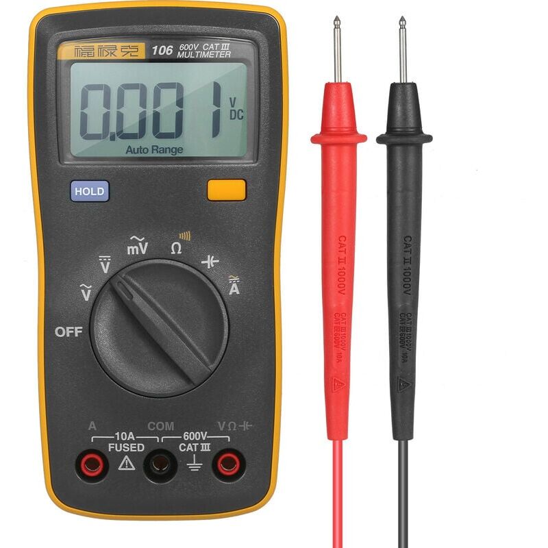 Questo multimetro digitale FLUKE 106 è appositamente progettato per aiutarti a ottenere il funzionamento con una sola mano, che include funzioni di test complete, comprese misurazioni di tensione CA e CC, corrente CA e CC, resistenza, capacità e continuità, applicabili alla misurazione elettronica di base, alla manutenzione elettrica e altri campi. Specifiche?: Modello: 106 Materiale: ABS Colore: Arancione e Nero Alimentazione: 2 batterie AAA (NON incluse) ? Durata della batteria: almeno 200 ore< br/> Visualizzazione: 6.000 conteggi Intervallo di tensione CC: 6?V / 60?V / 600?V Risoluzione tensione CC: 0,001?V / 0,01 V / 0,1 V Intervallo di risoluzione tensione CA: 6 V / 60 V / 600 V Risoluzione tensione CA: 0,001 V / 0,01 V / 0,1 V< br/> Gamma di corrente CC: 4 A/10 A Risoluzione corrente CC: 0,001 A/0,01 A Gamma di corrente CA: 4 A/10 A Risoluzione nominale corrente CA: 0,001 A / 0,01 A Intervallo di corrente CA mV: 600 mV Risoluzione mV CA: 0,1?mV < br />Gamma di resistenza: 400Ω