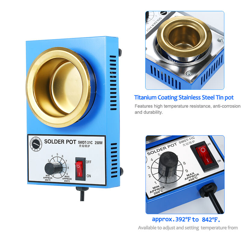 Questa è una mini pentola per saldatura con temperatura regolabile per uso industriale. Caratteristiche: Perfetto per stagnare o spellare fili, cablaggio, circuiti stampati, ecc. La base pesante e stabile aiuta a prevenire il ribaltamento, più sicuro da usare. Disponibile per regolare e impostare la temperatura da ca. 200 ℃ a 450 ℃ (392 ℉ a 842 ℉). La pentola di latta è realizzata in acciaio inossidabile rivestito in titanio, che presenta resistenza alle alte temperature, anticorrosione e durata. Il riscaldatore in acciaio inossidabile offre un efficace trasferimento di calore e un rapido aumento della temperatura. specifiche tecniche: Materiale: acciaio inossidabile con rivestimento in titanio Modello: SWDT-31C Potenza: 100 W / 150 W / 250 W / 300 W (Opzionale) Tensione di ingresso: AC220V, 50Hz Tipo di spina: UE Intervallo di temperatura: ca. Min. 200 ℃ a max. 450 ℃ (392 ℉ a 842 ℉) Tempo di fusione: ca. 8min Capacità: 800 g / 28,21 once Diametro interno del vaso: Φ80mm Dimensione