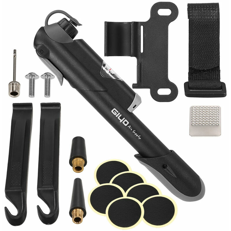 Con 6 kit di riparazione pneumatici senza colla - Contiene 6 kit di riparazione pneumatici senza colla e carta vetrata in una piccola scatola. COMPATIBILE CON PRESTA, SCHRADER E DUNLOP - Questa pompa da bicicletta include attacchi reversibili per valvole Schrader, Presta e Dunlop rendendo questa la migliore piccola pompa per bici per collegamenti stradali o MTB. VELOCE E FACILE 120 PSI - La nostra mini pompa per bici con manometro ad alta pressione si gonfia fino a 120 PSI. DUREVOLE E PORTATILE - Le nostre pompe per biciclette portatili sono realizzate in lega di alluminio di alta qualità con parti resistenti e precise. MULTI-UTILIZZO - Le nostre mini pompe sono adatte per bici da strada, mountain bike, BMX, bici per bambini, moto da cross, biciclette ibride, passeggini e altro ancora. Include un perno a sfera, che può gonfiare palloni da basket, palloni da calcio e altri palloni.