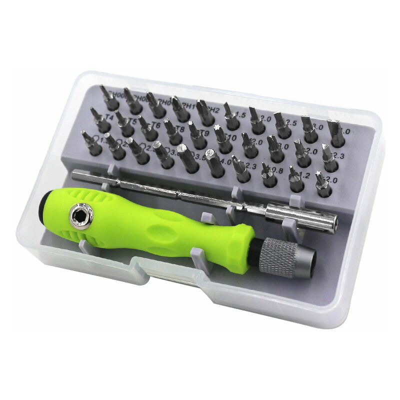 Caratteristiche: Set di utensili manuali per equipaggio fluviale di precisione a funzionamento bidirezionale 32 in 1. Professionisti di strumenti hardware portatili. Antiscivolo manico, è stato progettato ergonomicamente per rendere le cose comode per aumentare la coppia. Elevata durezza e buona tenacità e resistenza. Set completo di 32 teste batch, specifiche complete, possono essere adattate a lavorare in molti campi diversi. Adatto per la maggior parte dei prodotti digitali, vari tipi di computer, telefoni cellulari, foto di dispositivi, occhiali, orologi. Come strumento hardware professionale, ti fornisce con la funzione più potente. Specifiche: Materiale: acciaio Colore: verde e argento Lunghezza impugnatura: 103 mm Lunghezza della testa della vite: 28~101 mm Dimensioni della confezione: 12,3*7,5*3,4 cm La confezione include: 30 punte per cacciavite: Punta per cacciavite Phillips: PH000 PH00 PH0 PH1 PH2 Punta per cacciavite a taglio: 1,5 mm 2,0 mm 2,5 mm 3,0 mm 4 mm