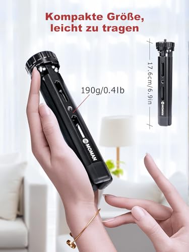 【Robusto e Stabile】Il mini treppiede Moman TR01S è realizzato in lega di alluminio di alta qualità, abbastanza forte e durevole da mantenere il treppiede stabile. Il mini Treppiede può sostenere un carico massimo di 5 kg.