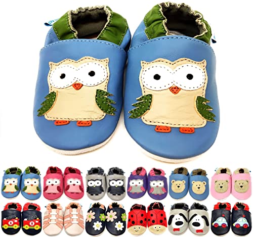 MiniFeet Premio Scarpe di Bambino di Cuoio Molli, Prime Scarpe da Passeggio, Simpatico Gufo Blu 12-18 Mesi