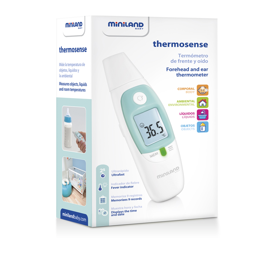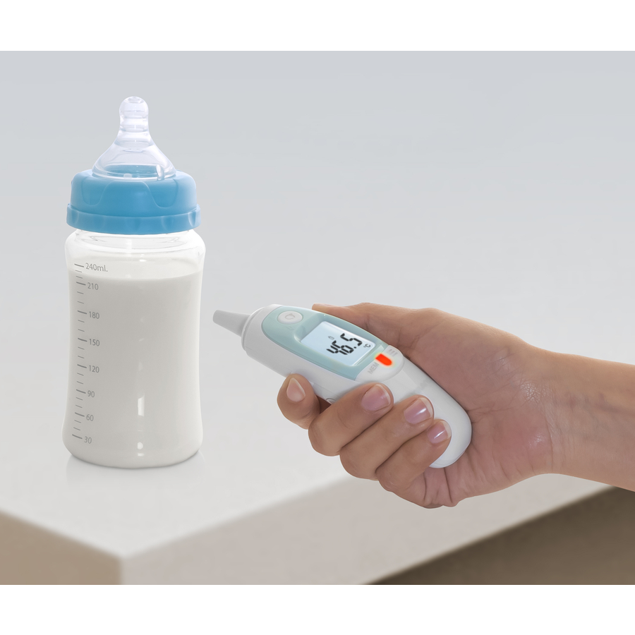 Termometro a contatto per orecchio e fronte con funzione di misurazione della temperatura per liquidi e oggetti. Termometro ergonomico e preciso Misura la temperatura utilizzando un sensore a infrarossi attraverso il contatto con la fronte o l'orecchio. Il design ergonomico lo rende facile e comodo da usare. Misurazione della temperatura degli oggetti e dell'ambiente I genitori possono utilizzarlo per determinare la temperatura del biberon del bambino, del cibo o dell'acqua del bagno, in quanto questo strumento può essere utilizzato anche per misurare la temperatura di liquidi e oggetti. Misura la temperatura ambientale La funzione di misurazione della temperatura ambientale può essere utilizzata in qualsiasi momento per verificare se le condizioni di temperatura nell'ambiente sono ottimali. Indicatore ottico di febbre Ha una luce LED che si illumina di rosso quando la temperatura misurata supera i 38°C. In questo modo, i genitori possono vedere in un colpo d'occhio se il loro bambino ha la febbre. Registrazione dei valori di temperatura misurati Lo strumento è dotato di una funzione di memorizazione che registra gli ultimi 9 risultati di misurazione. Visualizzazione dell'ora e della data La data, l'ora e la temperatura ambiente sono visualizzate sul display LCD Display . Messaggio di avvertimento per indicare la pulizia del sensore Un messaggio di avvertimento ricorda ai genitori la necessità di pulire il sensore a infrarossi per garantire l'accuratezza delle letture. Questa pulizia deve essere effettuata se lo strumento non è stato utilizzato per un periodo di tempo prolungato o dopo un uso ripetuto dello strumento. Esso emette quindi un tono di avvertimento e la retroilluminazione del Display lampeggia per un minuto. Spegnimento automatico per risparmiare energia In modalità di risparmio energetico, lo strumento si spegne automaticamente dopo 3 minuti di sonno per prolungare la durata della batteria. Dettagli del prodotto: Super veloce Elevata precisione Visualiz