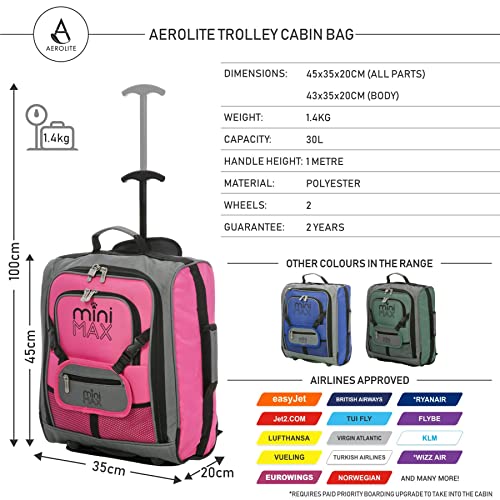 ? APPROVATO AEREAMENTE ? Questa borsa trolley è perfetta per una vasta gamma di compagnie aeree tra cui Ryanair (priority boarding), EasyJet, British Airways e Jet2 per citarne solo alcune. Dimensioni: 45x35x20cm (tutte le parti) / 43x35x20cm (corpo) Peso: 1.4kg Capacità: 30L