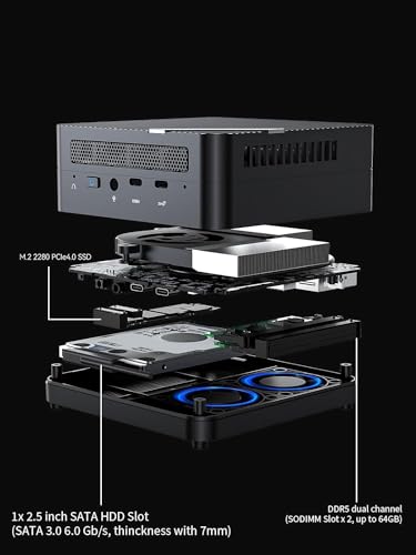 【RAM DDR5 e SSD PCIe4.0】 UM690S è dotato di RAM DDR5 a doppio canale da 32 GB (2 x 16 GB) e supporta l'espansione fino a 64 GB di RAM. Dotato di SSD M.2 2280 512 GB PCIe4.0, UM690S offre la possibilità di montare un SSD SATA o HDD di vecchia generazione (2,5 pollici) e non consuma molta energia.