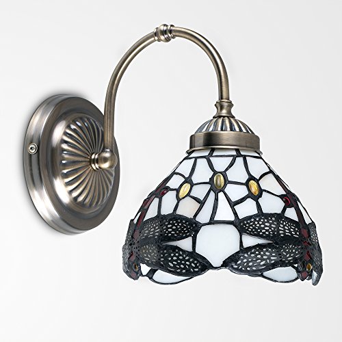 MiniSun - Lampada da parete tradizionale nello stile Tiffany con una finitura di colore d'ottone antico ed un paralume di vetrata col design di libellule - Lampada da muro