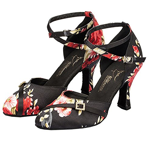 MINITOO Latino Salsa Donna Cinturino alla Caviglia con Fiori Nero Floreale Raso Sala Scarpe da Ballo Sandali da Sera EU 41