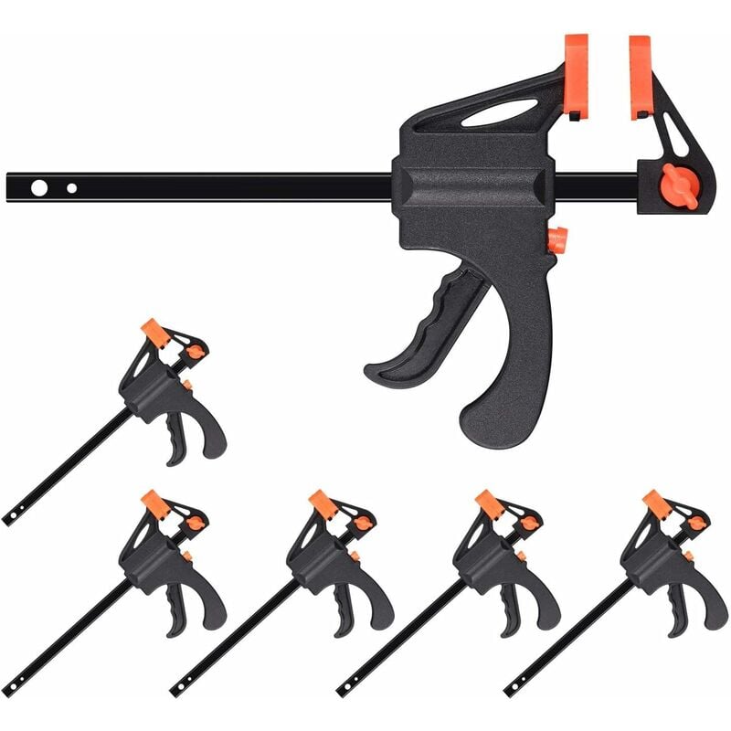 Operazione con una sola mano - L'impugnatura e il grilletto della pinza consentono l'operazione con una sola mano. Basta premere il grilletto della pinza a sgancio rapido, fino a raggiungere la posizione o la forza di serraggio ideale. [Sgancio rapido] I cuscinetti rimovibili che hanno un'eccellente resistenza ai graffi si afferrano saldamente. Le pinze con una sola mano possono serrare rapidamente e facilmente. Lo speciale design del grilletto delle pinze per la lavorazione del legno ti consente di rilasciare saldamente il morsetto quando si preme il pulsante di rilascio. [Distanza regolabile] Riceverai 6 unità di pinze per la lavorazione del legno. La forza dei morsetti F è di 60 kg/140 libbre. La distanza di serraggio può raggiungere 3-10 cm. [Forte e durevole] I morsetti G per la lavorazione del legno sono realizzati in acciaio di alta qualità con cuscinetti in plastica resistente e grilletto. Il morsetto della barra di metallo con polipropilene attorno è resistente e non si piega