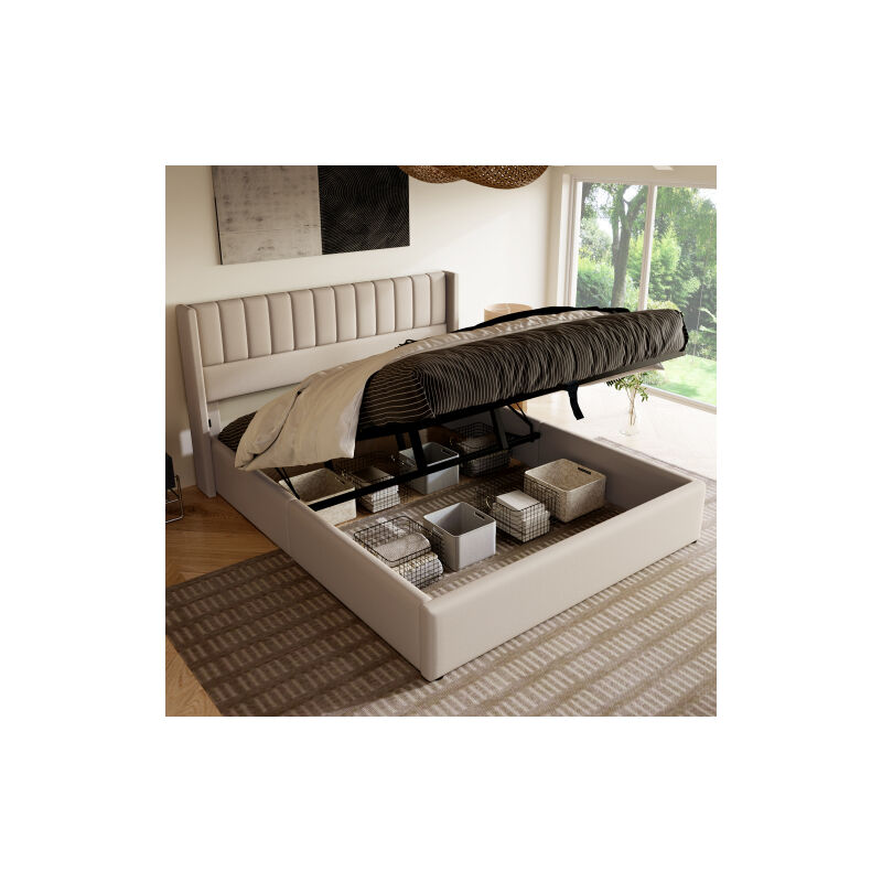Design moderno: il motivo a righe verticali sulla testiera aggiunge un tocco creativo al design. La sponda laterale curva della testiera è allo stesso tempo bella e pratica in quanto impedisce al materasso di spostarsi. Questo letto è disponibile in due colori: grigio e beige. Design umano :Il prodotto è inoltre dotato di un cordoncino in tessuto per salire e scendere facilmente dalla base idraulica. La testiera imbottita ti consente di leggere comodamente un libro a letto, offre alla tua schiena un comodo sostegno. Barra idraulica - Ampio spazio di stivaggio: Ampio box letto sotto la rete a doghe pieghevole con abbondanza di spazio per riporre coperte, cuscini o biancheria da letto, rete a doghe facilmente ripiegabile grazie al cilindro di sollevamento. Costruzione solida: Realizzata con materiali di altissima qualità, per garantire che il letto duri per molti anni. L'hardware robusto e le gambe di supporto aggiuntive forniscono stabilità complessiva del letto. Informazioni