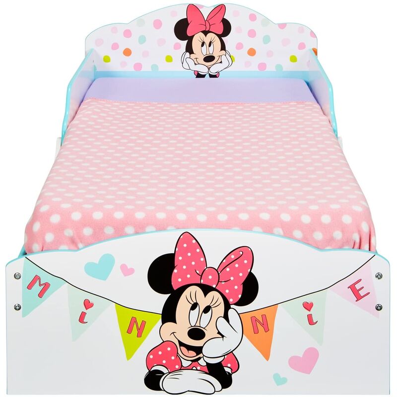 Ecco il nuovo comodissimo letto di Minnie simpatico ed accogliente per le nostre bambine, sicuro e semplice da montare per i genitori. Questo lettino aiuta le bimbe a compiere l'emozionante passaggio dalla culla al lettino. La base vicina al pavimento e le sponde di sicurezza evitano i capitomboli, e i due contenitori sottoletto rivestiti in tessuto aiutano a mantenere ordinata la cameretta. Accoglie un materasso di dimensioni 140 cm x 70 cm. Materasso non incluso.