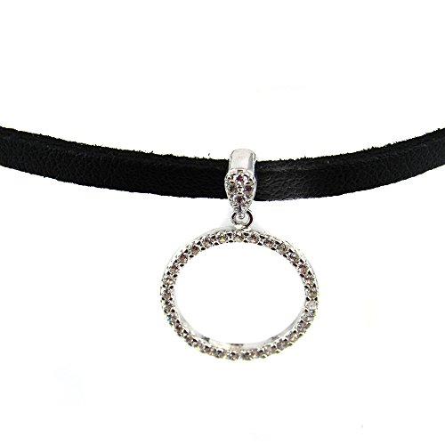 Minoplata Choker in pelle nera con ciondolo cerchio in argento e zirconi, un gioiello stile anni Noventa ideale per una donna sofisticada
