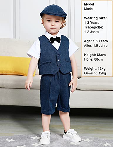 Design: abiti da battesimo per neonato, abiti da 4 pezzi moda (pagliaccetto a manica corta con papillon, cinturino, gilet e cappello retrò)