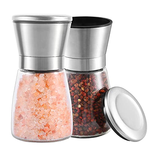 Materiale di Alta Qualità: il macinino pepe e sale è realizzato in acciaio inossidabile opaco, macinino in vetro e ceramica e il corpo della bottiglia in vetro trasparente di grande capacità può controllare l'equilibrio del condimento in qualsiasi momento, il che è conveniente per identificare il condimento. Il design con coperchio in acciaio inossidabile può garantire la tenuta dello shaker di sale e pepe, bloccare l'umidità e la polvere nell'aria e mantenere il gusto fresco delle spezie
