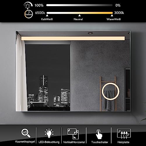 MIQU Specchio da bagno con illuminazione, 100 x 70 cm, bianco caldo/bianco freddo, luce LED da parete con presa di corrente, ingrandimento 3x, touch senza appannamento, senza orologio