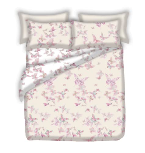 Mirabello Completo Lenzuola Matrimoniali in fine Percalle di Cotone, Effetto copriletto con Doppia Balza art. Butterfly (Rosa fondo Beige 03M)