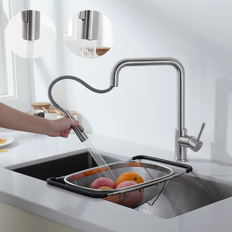 Cecipa Miscelatore Cucina con Doccetta Estraibile - Rubinetto Lavello in Acciaio Inox Girevole a 360° con 2 Modalità di Uscita Acqua - Spazzolato Descrizione del prodotto: Qualità eccellente: → Il rubinetto è realizzato in acciaio inossidabile 304 di alta qualità, che ha prestazioni elevate e non è facile da danneggiare. La superficie è nera elettroforetica, anti-impronta e antigraffio. Con funzione estraibile: → Il miscelatore da cucina è dotato di funzione estraibile ed è estraibile fino a 400 mm di lunghezza. Grazie alla testa estraibile con corpo in acciaio inox 304 potrai pulire meglio e più velocemente intorno al lavello e negli angoli. 2 modalità di uscita dell'acqua: → Questo rubinetto da cucina ad alta pressione ha 2 modalità di spruzzo. L'acqua che esce dall'acqua classica è dolce, resistente agli spruzzi, facile da pulire e fa risparmiare fino al 40% di acqua. L'acqua della doccia può rimuovere efficacemente lo sporco dai piatti. È possibile cambiare facilmente 2 modalità