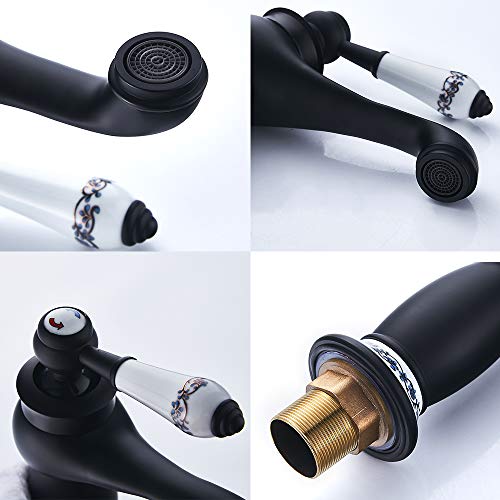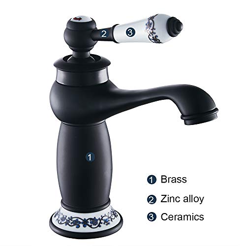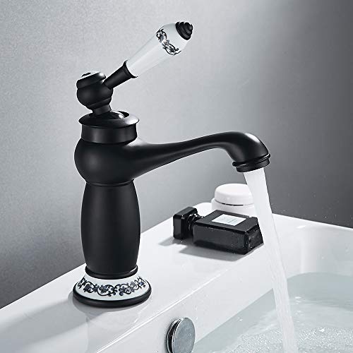 Miscelatore Lavabo Bagno Nero Classico Vintage in Ottone Cromato Rubinetto Bidete da Bagno Monocomando in Ceramica Floreale Elegante (Basso, Nero)