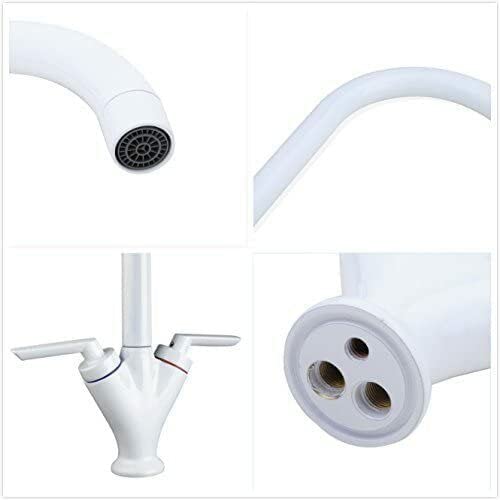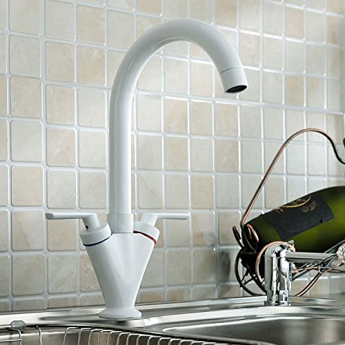 Miscelatore rubinetto monoblocco a collo di cigno bianco per lavello da cucina, a doppia leva, con beccuccio girevole a 360 gradi, con tubi di fissaggio standard