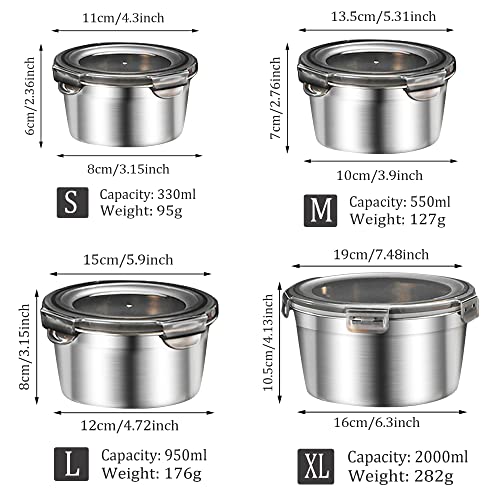 Misichao Contenitori in Acciaio Inox Ermetici per Alimenti 4 Pezzi Contenitori di Metall Riutilizzabili, Contenitori per la preparazione dei pasti 0.33-2L