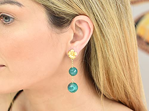 MISIS -Orecchini Donna in Argento 925 placcato Oro 18kt - Fiore Pendente con Pietra Agata Verde - Made in Italy