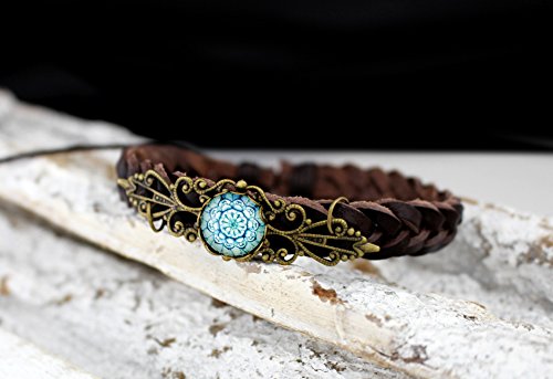 Miss Lovie, bracciale vintage, intrecciato, in pelle, con cabochon, motivo a foglia, colore: blu e bronzo