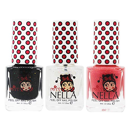 Miss Nella PARTY COLLECTION 1- Scatola da 3 smalti peel off, senza odori, a base d'acqua e sicuro per bambini- Surprise Party (black), Confetti Clouds (clear) & Marshmallow Overloud (coral)