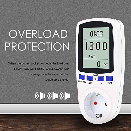 Protezione da sovraccarico: Il misuratore dei costi energetici non appena tutta la potenza supera la potenza nominale del monitor, il display LCD "OVERLOAD" mostra con gli appositi gads per avvisare l'utente, ideale per il monitoraggio del consumo di energia degli elettrodomestici.