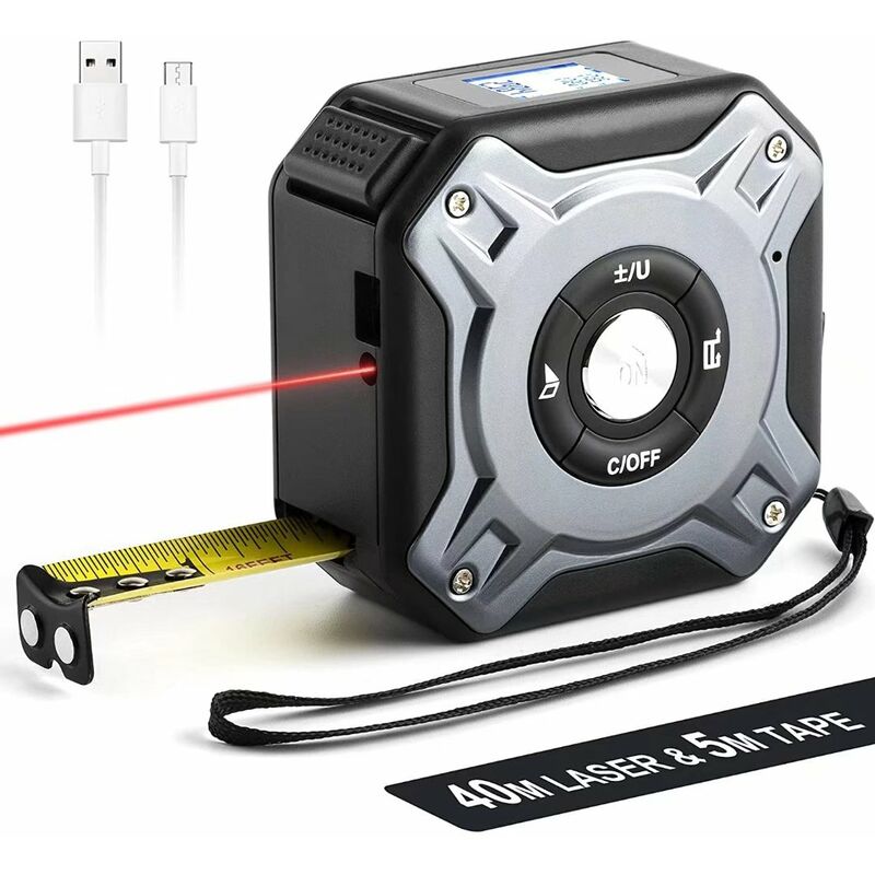 Misura precisa 2 in 1: misura laser + metro a nastro. Portata laser: 40 m, metro a nastro: 5m. Alta precisione ± 2 mm Misuratore: larghezza nastro 19 mm, lunghezza estensibile 5 m. Scala a doppia faccia;