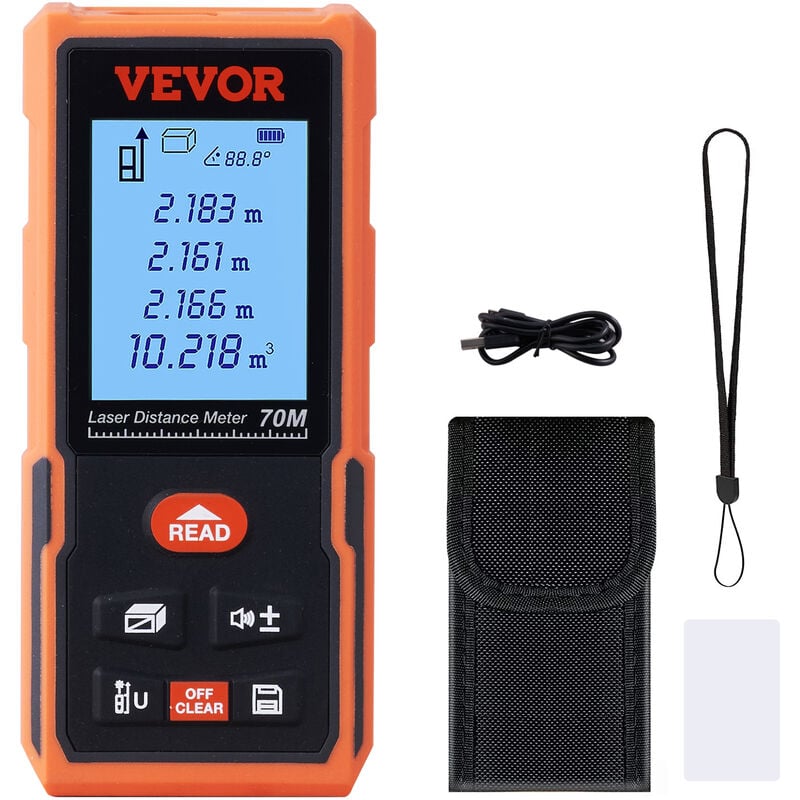 Misuratore Laser di Distanza da 70m di VEVOR La prima scelta per te Il telemetro laser e preciso fino a 1,5 mm e offre una serie di funzioni di misurazione. Con uno schermo retroilluminato da 2", funzione di trasmissione vocale e memorizzazione di 99 set di dati. Precisione alta Funzioni multiple Lettura facile dei dati 99 gruppi dei dati Robusto & maneggevole Caratteristiche & Dettagli Precisione Alta: il misuratore laser di distanza di VEVOR fornisce una precisione migliorata fino a 1,5mm a 70m. L'angolo elettronico viene visualizzato in tempo reale, facilitando lindividuazione della direzione orizzontale e fornendo misure piu accurate rispetto alla livella a bolla. Questo strumento di misurazione laser aiuta a stimare tappeti e piastrelle per case, applicazioni edili e altri settori, specialmente per spazio largo come stanze, edifici e magazzini. Funzioni Multiple: il misuratore laser di distanza presenta le diverse modalita di misurazione, tra cui area, distanza, lunghezza, volume