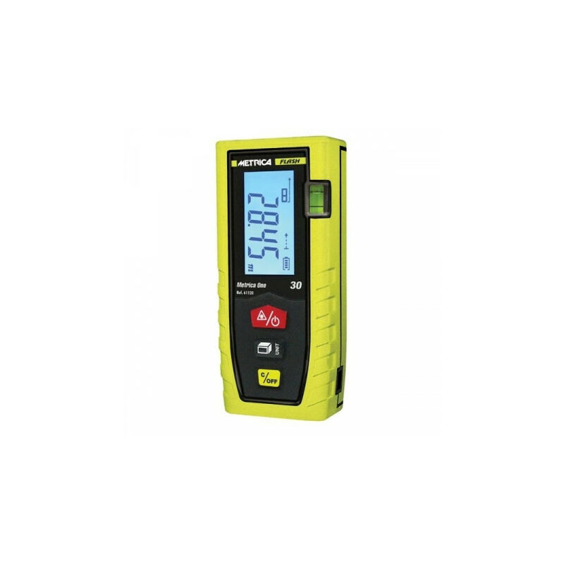Display retroilluminato su 1 riga Schermo ad alta visibilità Funzione misurazione continua Distanze, superfici, volumi 1 fiala Autospegnimento Funzione sonora Con cinghietta In astuccio CARATTERISTICHE TECNICHE: Precisione rilevamenti: + / - 2,0 mm Portata*: fino a 30 m Durata Batterie . fino a 8000 misure Tipo di laser:635 nm