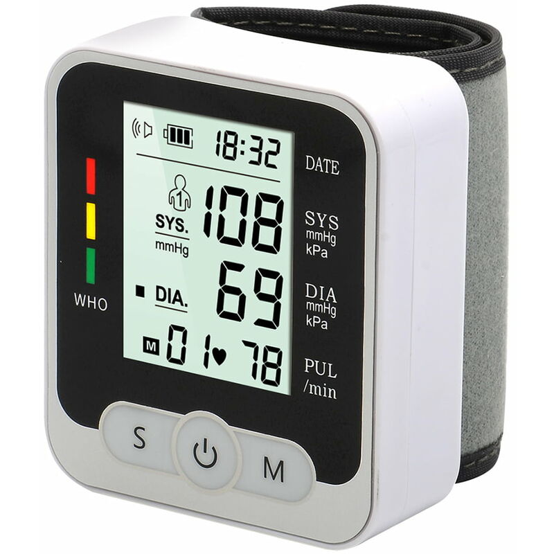 Funzione di annuncio vocale. Dopo la misurazione, il monitor della pressione sanguigna ti dirà il risultato. Adatto ad anziani e persone con problemi di vista. Grande schermo LCD di facile lettura. L'ampio schermo rende il monitor più comodo da usare. Modalità doppio utente per condividere con il coniuge o la persona amata: La modalità doppio utente porterà comodità per l'uso domestico. L'archiviazione di gruppo 99X2 con conservazione di data e ora ti consente di monitorare e confrontare i record sempre e ovunque. Misuratore della pressione sanguigna da braccialetto intuitivo premendo un pulsante. Il misuratore di pressione sanguigna da polso completamente automatico rende facile misurare te stesso! Lo sfigmomanometro da polso è il regalo perfetto per genitori, persone care o amici. Campo di misurazione Pressione: 0~280mmHg (0kPa-37.3kPa) Impulso: 40~199 battiti al minuto Precisione Pressione: entro 3 mmHg Polso: entro il 5% Pacchetto incluso. 1 x sangue misuratore di pressione 1