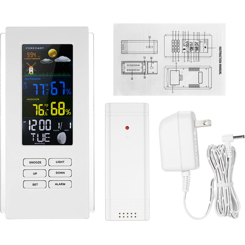 L'orologio multifunzione per temperatura e umidita con funzione di previsioni meteorologiche offre molta comodita per la tua vita quotidiana. e a risparmio energetico e comodo da usare. Caratteristiche: Display colorato e piacevole per gli occhi. Misurare la temperatura e l'umidita, selezionabili ° C o ° F. Record max. e min. valore di temperatura e umidita. Display dell'orologio, commutabile in 12/24 ore. Mostra ora, data, mese e settimana e puoi impostare ora, data, mese, anno da solo. Con sveglia, funzione snooze, meteo, livello di comfort, indicazione dell'andamento della temperatura, davvero pratico. Senti il clima circostante e rendi la famiglia piu armoniosa. Il design ad angolo smussato lo rende facile da posizionare ovunque. Un totale di 5 livelli, da confortevole a troppo freddo o troppo caldo. Le frecce dell'andamento della temperatura indicano se sta diventando piu caldo o piu freddo vicino al sensore remoto. Alimentato da batterie 2 * LR6 AA (non incluse). specifiche