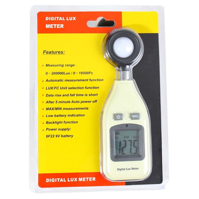 Luxometer Lux Lux e FC Focontelas Meter. Luxometter misuratore di luce portatile. Misura in Lux o FC Candela fotografica. Misurazione rapida e con scarsa ritardo. La misurazione va da 0 a 200.000 lux. Funzioni massime, max, contraluz, ecc. auto fuori dopo 5 minuti senza utilizzo. Il misuratore di luce Luxomether mantiene le batterie Batteria da 9 V inclusa . Indicazione a bassa batteria. Dimensioni ridotte 165*53*36 mm < /bolroup> Riferimento JND-79801 misura 0-200.000 Lux 0-18.500fc Precision +/- 3% & lt;