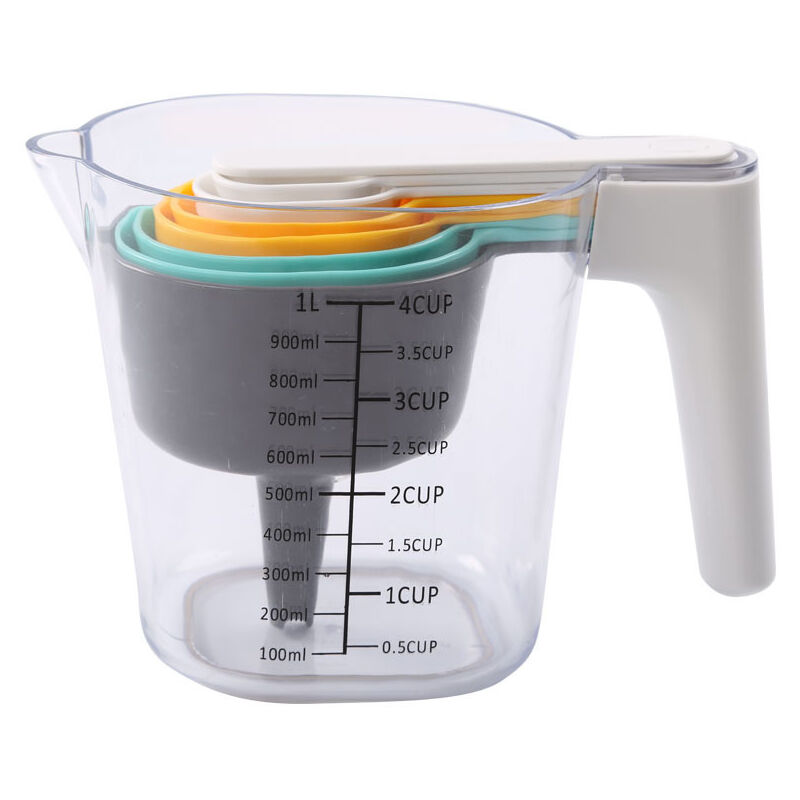 Peso: 200 g Taglia: 20,2*11*13,6 cm Colore: come mostrato DESIGN MISURATORE E CUCCHIAIO - Il design impilabile è utile per una buona organizzazione e conservazione nell'armadio o in cucina senza rendere l'intero utensile da cucina più ingombrante MATERIALE SICURO DI ALTA QUALITÀ - Robusta plastica AS e ABS per uso alimentare, 100% senza BPA, LFGB Standard europeo, lavabile in lavastoviglie. 10 PZ DESIGN COMPATTO - Include misurino da 1 litro + 1 raschietto + 1 imbuto + 6 misurini (1 tazza, 1/2 tazza, 1/3 tazza, 1 / 4 tazze, 1 cucchiaio, 1/2 cucchiaio). È perfetto per ingredienti umidi o secchi come farina, polvere, fagioli, spezie e condimenti. MISURAZIONI PRECISE E PERFETTE - Appoggia la tazza per versare l'acqua con dosaggio preciso toccando il pulsante Guarda il scala sulla tazza. Ogni misurino presenta un'accurata misurazione della capacità, in modo da ottenere una quantità precisa con i misurini.