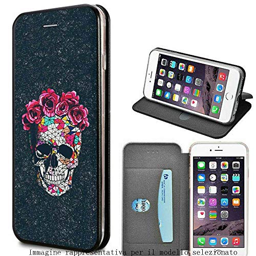 Mixroom - Custodia Cover Case a Libro Nero per iPhone 13 con Stand in Ecopelle Chiusura Magnetica Parte Interna in TPU Morbida Fantasia LN589 Teschio con Cappello di Rose