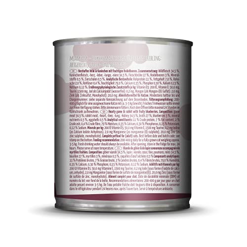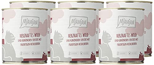 MjAMjAM - cibo umido premium per gatti - sostanziosa selvaggina e coniglio con mirtilli fruttati, confezione da 6 (6 x 800 g), senza cereali con carne extra
