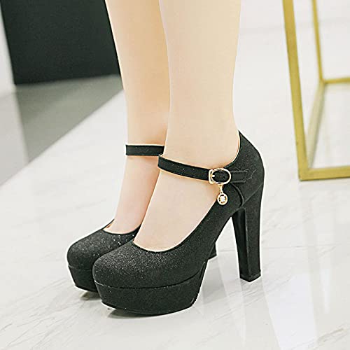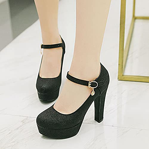 MJIASIAWA Bride con Cinturino alla Caviglia Brillantini Sposa Tacco Alto Plateau Pump Vestito Sequin Donna Serata Tacco A Blocco Pump Nero Numero 36 EU