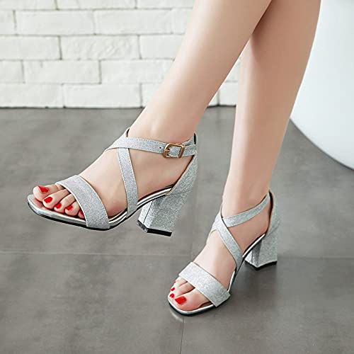 MJIASIAWA Donna Sposa Festa Strappy Punta Aperta Moda Tacco A Blocco Sandali Eleganti Serata Tacco Alto Scarpe Festa Argento Numero 41 EU/43 Asiatico