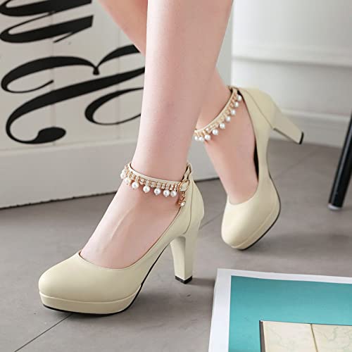 MJIASIAWA Donna Sposa Tacco A Blocco Beaded Eleganti Plateau Scarpe Punta Rotonda Festa Tacco Alto Pump Closed Toe Vestito Beige Numero 33 EU