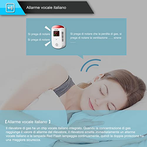 【Previeni l'esplosione di gas e proteggi la tua famiglia】 Il nostro rilevatore di gas può monitorare in tempo reale la concentrazione di gas nell'aria. Quando una perdita di gas supera lo standard, questo allarme emetterà continuamente una voce di sirena da 80-110 dB e un avvertimento vocale italiano vivace con luce rossa lampeggiante superiore fino a quando il volume di gas ambiente scende al di sotto del setpoint di allarme.proteggere la tua famiglia.