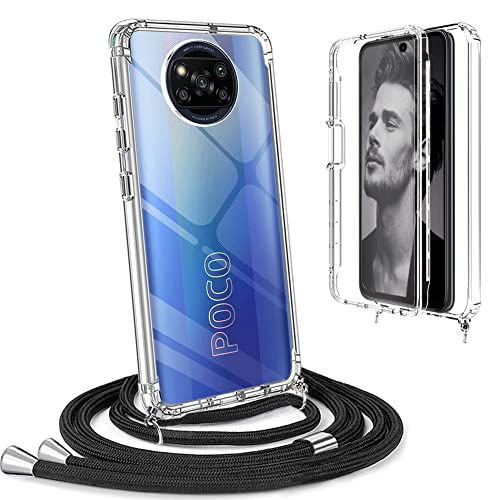 Mkej 3 in 1 Case Cellulare Girocollo per Xiaomi Poco X3 NFC Cover Protezione con Tracolla, con Protezione Integrata dello Schermo, 360 Gradi Full Body Trasparente Cordoncino Custodia, Nero