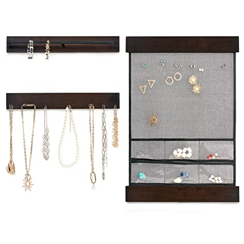 Organizzatore per gioielli da parete: incluso 1 x supporto per collana con 10 ganci, 1 x barra per bracciale e 1 x porta orecchini con tasche antipolvere. Tieni organizzati i tuoi gioielli.