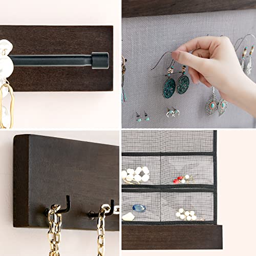 Mkono Set di 3 collane da appendere a parete in legno rustico, orgaznizer per orecchini, collane, bracciali, occhiali da sole, chiavi, gioielli con 10 ganci e 6 tasche trasparenti antipolvere