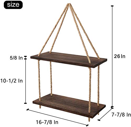 Mkouo Wood Hanging Shelf Wall Swing Storage Shelves Jute Rope Organizer Rack, 2 Tier