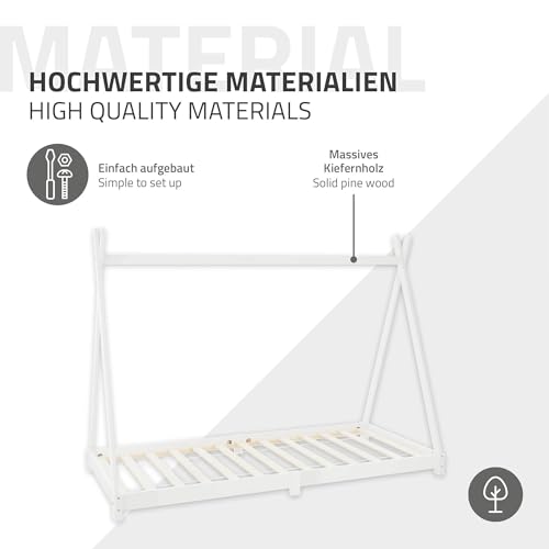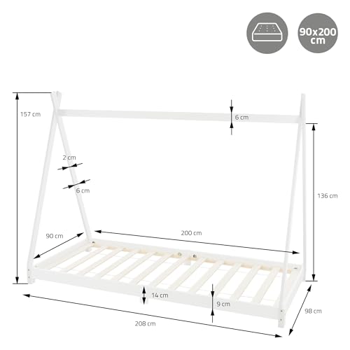 ML-Design Lettino per Bambini a Forma di Tenda Indiana con Rete a Doghe 90 x 200 cm Letto Tipi da Gioco in Legno di Pino Massiccio Bianco Stile Montessori con Materasso Sfoderabile in Schiuma Fredda