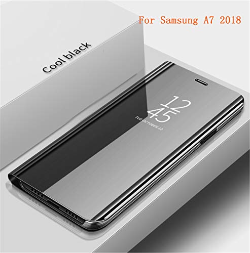 MLOTECH Cover per Samsung A7 2018 Custodia + Vetro temperato Flip Traslucido Clear View Specchio Standing Cover Anti Shock Placcatura Smart Cover Custodia Protezione Nero