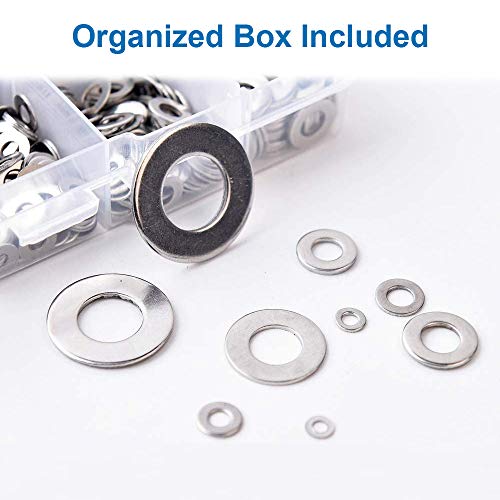 Il pacchetto include Confezione di 360pz Flat Washer Spacer, di cui 8 delle dimensioni più utilizzate M2 Rondella piatta 50pz M2.5 Rondella piatta 50pz, M3 Rondella piatta 50pz, M4 Rondella piatta 50pz, M5 Rondella piatta 50pz, M6 Rondella piatta 50pz, M8 Rondella piatta 40pz, M10 Rondella piatta 20pz