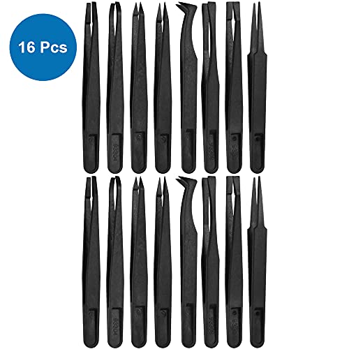 MMOBIEL Set di 16 pinzette di precisione in plastica antistatica, pinzette con punta piatta appuntita/punte curve, pinzette per elettronica, creazione di gioielli, lavori di laboratorio, colore nero