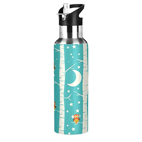 Mnsruu Arte Bianca Gufi della Foresta Uccello Borraccia Termica con Cannuccia Sportiva, Bottiglia Acqua in Acciaio Inox Isolato 600ML Senza BPA per Bevande Calde e Fredde per Bambini Scuola