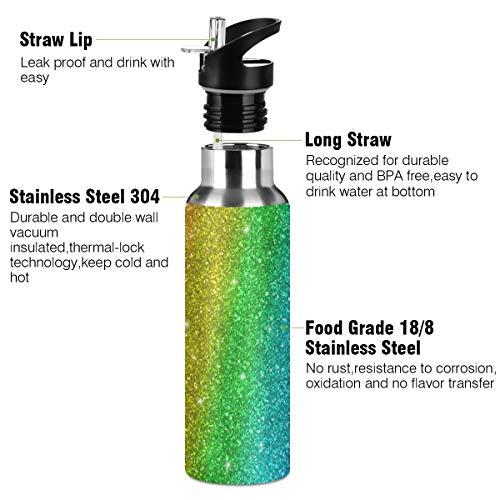 MNSRUU - Borraccia termica con brillantini arcobaleno, per ragazze e ragazzi, in acciaio inox, con cannuccia, 567 ml